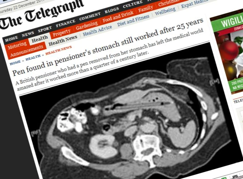 Cierpiąca na bóle żołądka, utratę wagi i biegunkę 76-letnia kobieta poddała się zabiegowi endoskopii. Ku zdumieniu personelu medycznego, z jej żołądka wydobyto długopis, który przypadkiem połknęła ćwierć wieku temu. Ten wypadek zdarzył się na początku 1986 roku, kiedy usiłując obejrzeć sobie migdałki, kobieta poślizgnęła się i upadła, a długopis wpadł jej do przełyku. Kobieta udała się do szpitala, ale ani jej mąż, ani lekarze nie uwierzyli w taki przebieg wydarzeń, kiedy skany i zdjęcia rentgenowskie długopisu nie pokazały. W końcu Brytyjka zrezygnowała z leczenia i zapomniała o tej przygodzie.