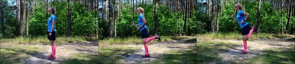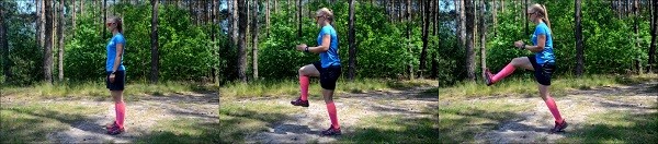 Skip A- jest to bieg z wysokim unoszeniem kolan do góry. Powinniśmy ćwiczenie wykonywać do kąta 90° między udem, a tułowiem.