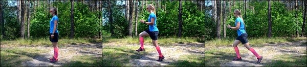 Opis pozycji biegacza górna część ciała to mięśnie szyi i szczęki, powinny być rozluźnione. Obręcz barkowa nie może być usztywniona. Przechodząc do centralnej części ciała, należy zwrócić uwagę na kąt w stawie łokciowym, który powinien wynosić 90°. Łokcie przy ciele. Podczas biegu należy się pochylić do przodu, dzięki czemu zyskamy siłę napędową. Mięśnie miednicy powinny być rozluźnione. Udo wraz z kolanem i stopą powinno się unosimy w linii prostej w kierunku biegu. Na koniec należy skupić się na kroku biegowym, który następuje ze śródstopia i palców. Nie lądujemy na pięcie.