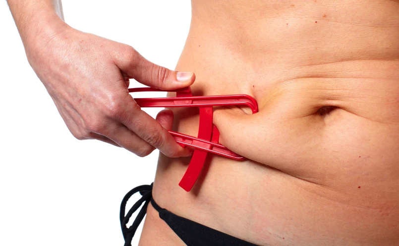 Jak w takim razie ustalić zawartość tkanki tłuszczowej w organizmie? Prostym sposobem na określenie dystrybucji tłuszczu w naszym organizmie jest pomiar obwodu w talii. Wynik przekraczający 102 cm u mężczyzn i 88 cm u kobiet świadczy o nadmiernej kumulacji tkanki tłuszczowej w jamie brzusznej, nawet jeśli BMI jest prawidłowe. Trochę doskonalszym, ale także nie do końca miarodajnym sposobem, jest użycie fałdomierza. To przyrząd, którym ściska się skórę w kilku miejscach – pod łopatką, nad kością biodrową, na ramieniu – i odczytuje wynik. Nadal jednak nie wiemy, ile procent masy ciała stanowią nasze mięśnie, tłuszcz i woda. Taką szczegółową wiedzą można uzyskać z badania BIA (ang. Bioelectrical Impedance Analysis), czyli analizy bioelektrycznej impedancji, nieinwazyjnej metody analizy składu ciała wykorzystującej opór elektryczny poszczególnych tkanek. Wykonanie pomiaru i jego monitorowanie jest konieczne, jeśli poważnie podchodzimy do tematu odchudzania i zależy nam na efektach stosowanej diety. Badanie jest proste, bezpieczne i trwa zaledwie kilka sekund. Urządzenie w podstawowej wersji przypominające wagę łazienkową emituje prąd o niskim natężeniu i rejestruje rezystancję ze strony tkanki. Prąd przepływający przez tłuszcz napotyka większy opór niż w przypadku mięśni. Na tej podstawie można dokładnie określić: